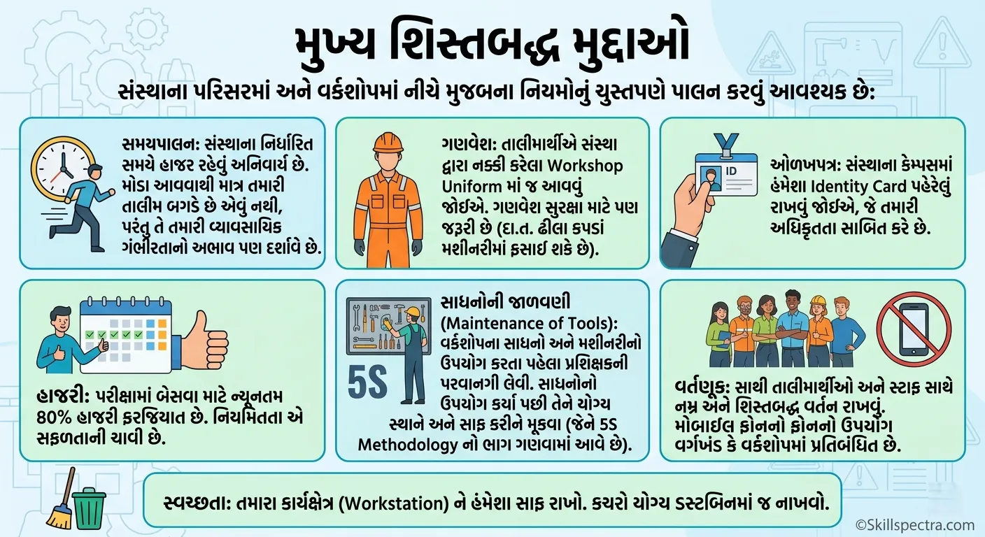 - વર્તણૂક (Behavior): સાથી તાલીમાર્થીઓ અને સ્ટાફ સાથે નમ્ર અને શિસ્તબદ્ધ વર્તન રાખવું. મોબાઈલ ફોનનો ઉપયોગ વર્ગખંડ કે વર્કશોપમાં પ્રતિબંધિત છે.