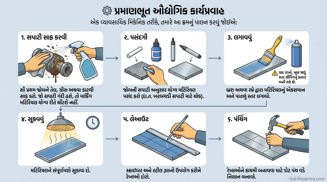 1. સપાટીની સફાઈ (Cleaning): સૌથી પહેલા જોબ (Job) ને તેલ, ગ્રીસ અથવા કાટથી સાફ કરો. જો સપાટી ગંદી હશે, તો માર્કિંગ મટીરીયલ બરાબર ચોંટશે નહીં.