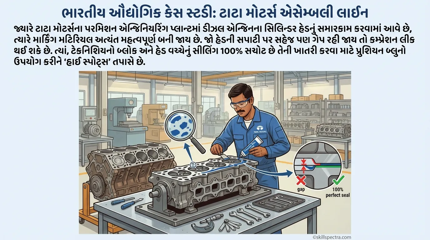 જ્યારે Tata Motors ના પર્મિશન એન્જિનિયરિંગ પ્લાન્ટમાં ડીઝલ એન્જિનના સિલિન્ડર હેડ (Cylinder Head) નું રિપેરિંગ થતું હોય, ત્યારે માર્કિંગ મટીરીયલ અત્યંત મહત્વનું બની જાય છે. જો હેડની સપાટી પર સહેજ પણ ગેપ રહી જાય, તો કમ્પ્રેશન લીક થઈ શકે છે. ત્યાં ટેકનિશિયનો પ્રુશિયન બ્લુ નો ઉપયોગ કરીને ‘હાઈ સ્પોટ્સ’ (High Spots) ચેક કરે છે, જેથી ખાતરી થાય કે બ્લોક અને હેડ વચ્ચેનું સીલિંગ 100% પરફેક્ટ છે.