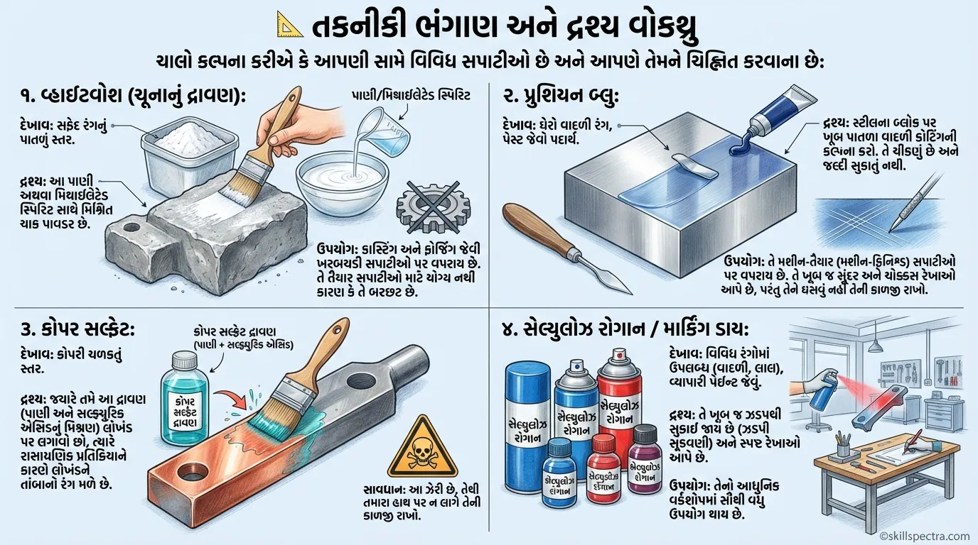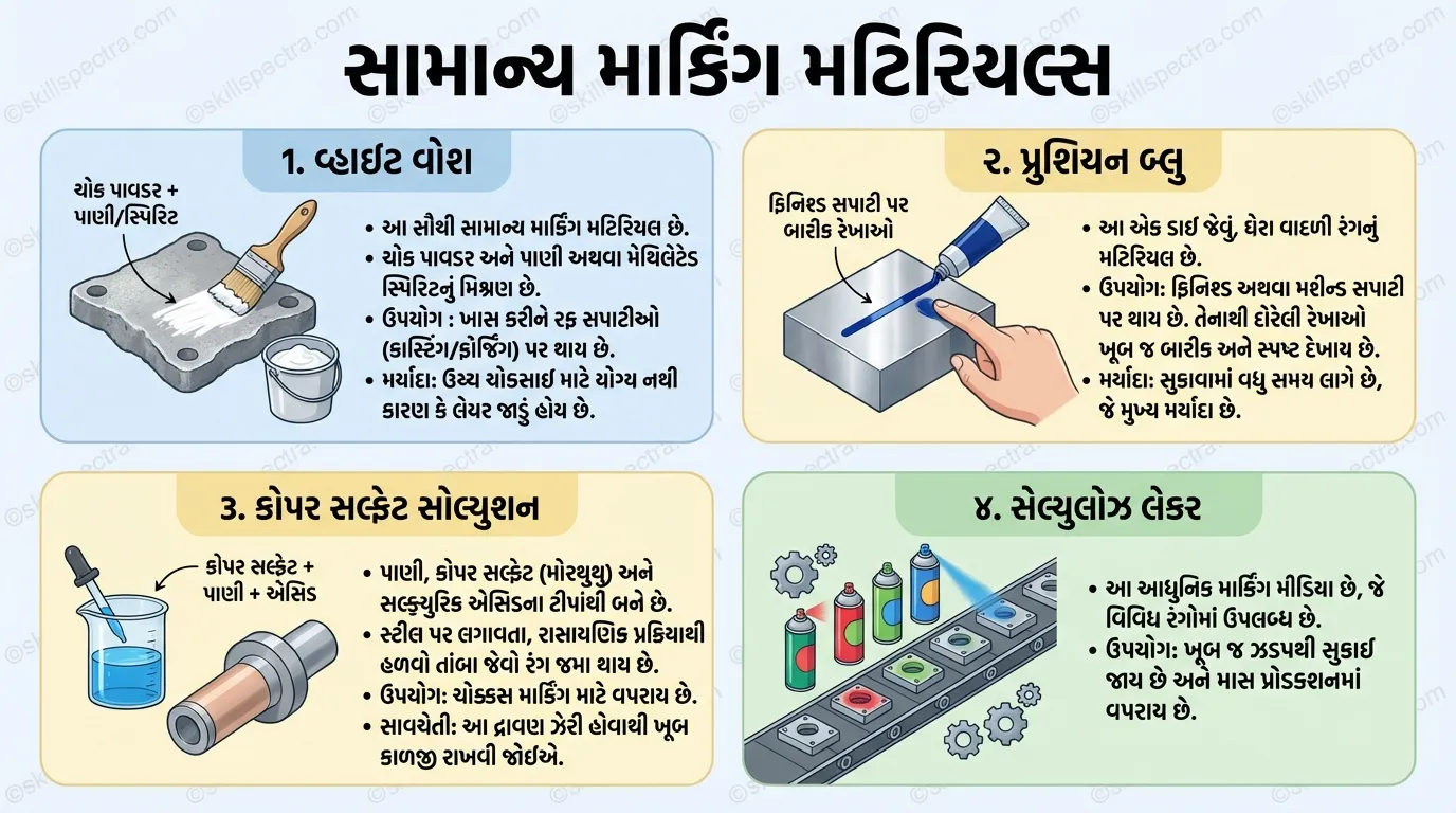 વર્કપીસની સપાટીની સ્થિતિ (Surface Finish) અને જરૂરી ચોકસાઈના આધારે નીચે મુજબના માર્કિંગ મટીરીયલ્સનો ઉપયોગ થાય છે: