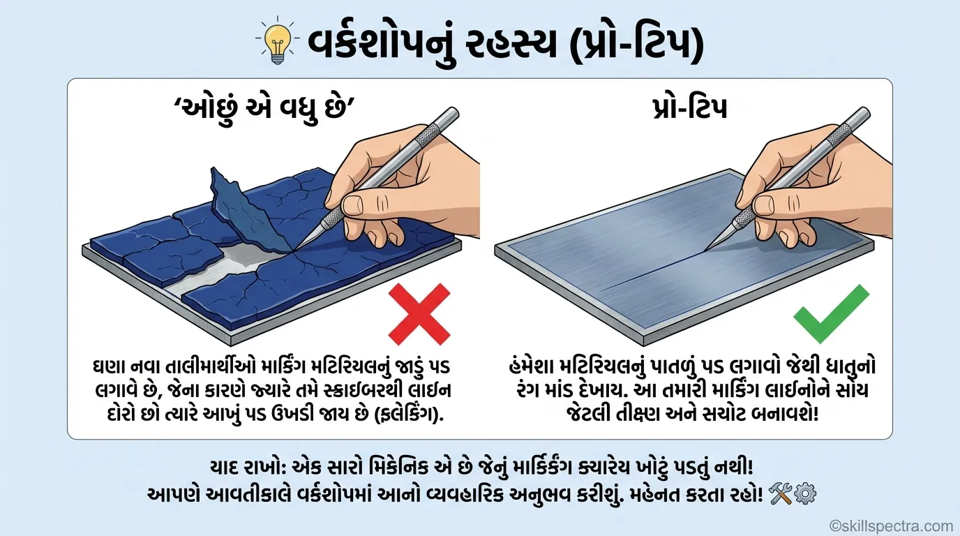 “લેસ ઇઝ મોર” (Less is More): ઘણા નવા તાલીમાર્થીઓ માર્કિંગ મટીરીયલનું જાડું પડ લગાવી દે છે, જેના કારણે જ્યારે તમે સ્ક્રાઇબરથી લીટી દોરો છો ત્યારે આખું પડ ઉખડી જાય છે (Flaking).