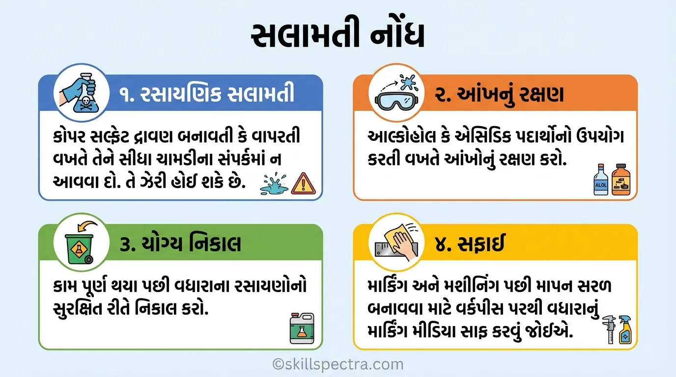 - રાસાયણિક સાવચેતી: Copper Sulphate જેવા કેમિકલનો ઉપયોગ કરતી વખતે તે આંખ કે મોઢામાં ન જાય તેનું ધ્યાન રાખવું. કામ પત્યા પછી હાથ સાબુથી બરાબર ધોવા.