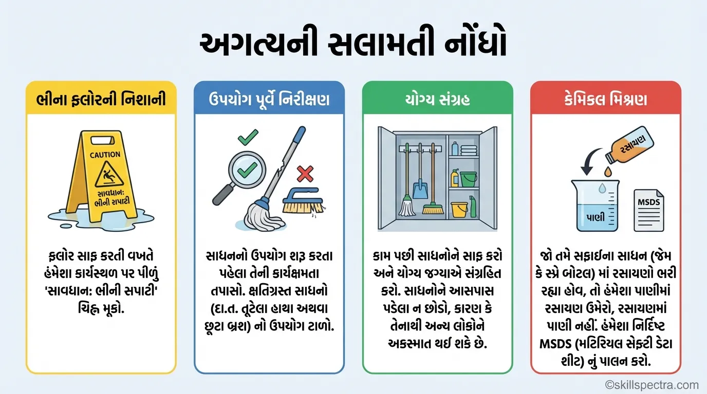 – **વેટ ફ્લોર સાઇન (Wet Floor Sign):** જ્યારે પણ ફ્લોર મોપિંગ કરતા હોવ, ત્યારે કાર્યસ્થળ પર “સાવધાન: ભીની સપાટી” ના પીળા બોર્ડ અવશ્ય મૂકો.