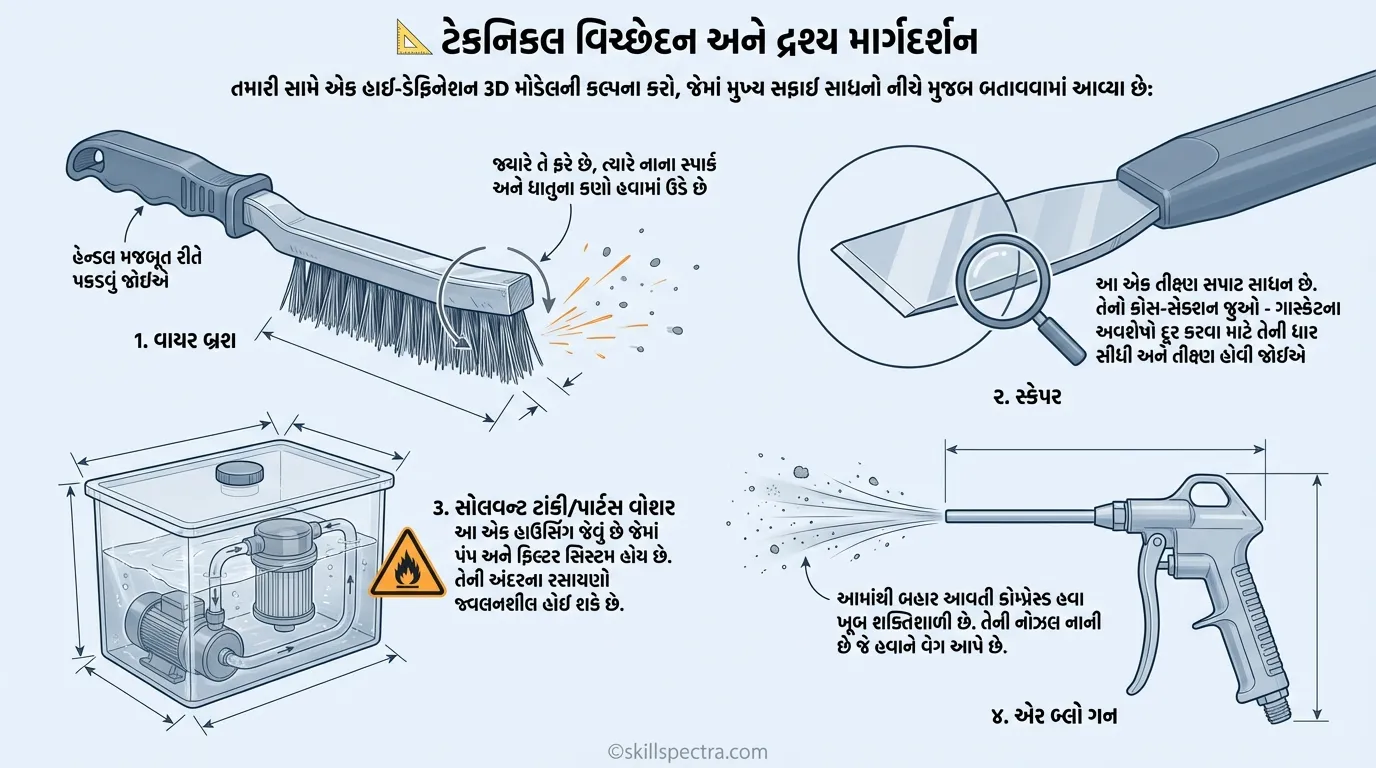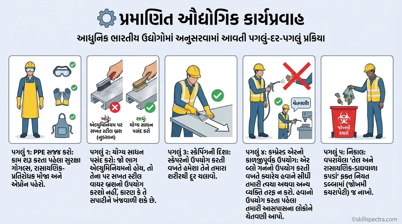2. **સુરક્ષા એ જ બચાવ:** સફાઈના સાધનો જેવા કે વાયર બ્રશ (Wire Brush) અથવા કેમિકલ્સનો અયોગ્ય ઉપયોગ આંખ, ત્વચા અને ફેફસાંને ગંભીર નુકસાન પહોંચાડી શકે છે.