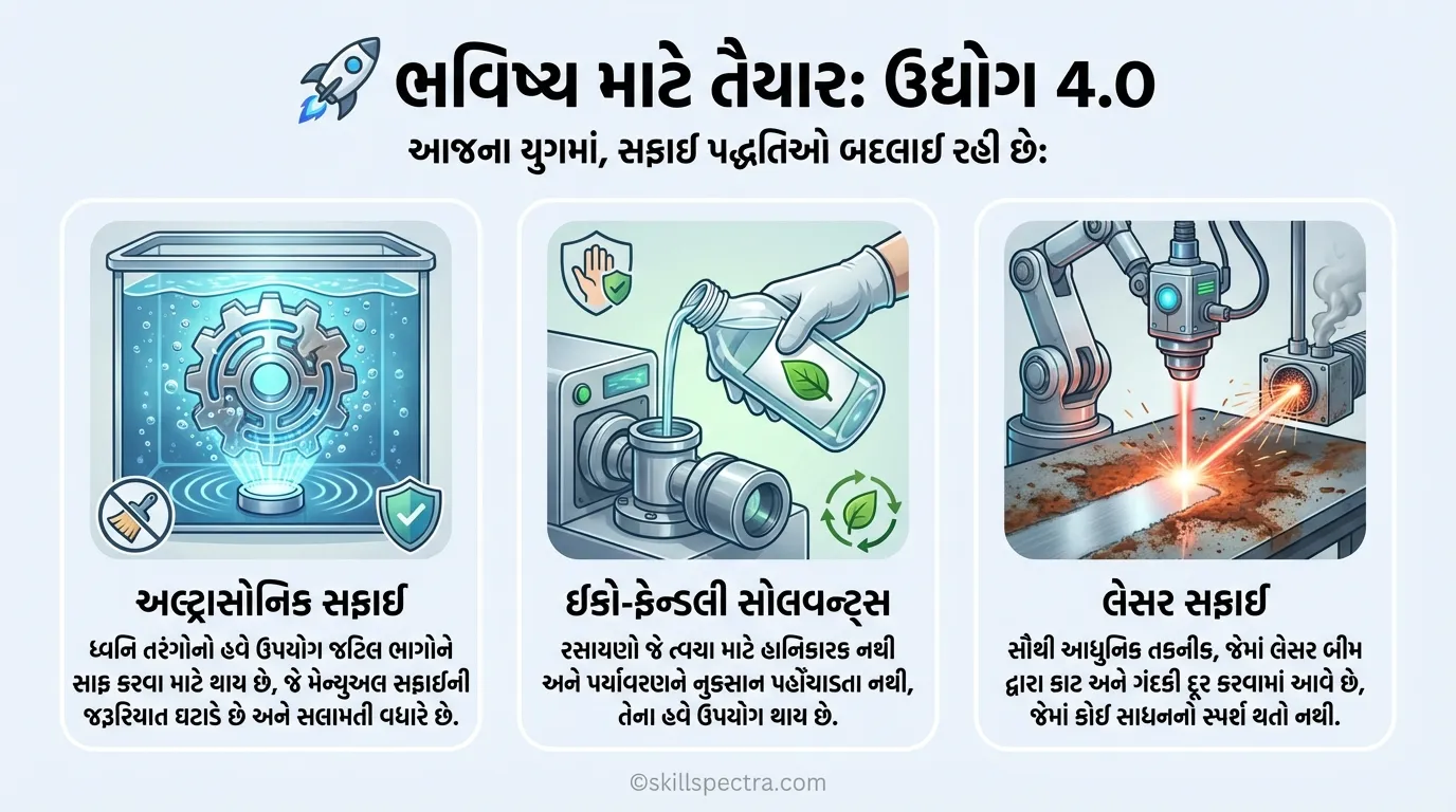 * **અલ્ટ્રાસોનિક ક્લિનિંગ (Ultrasonic Cleaning):** હવે જટિલ પાર્ટ્સને સાફ કરવા માટે ધ્વનિ તરંગોનો ઉપયોગ થાય છે, જે મેન્યુઅલ સફાઈની જરૂરિયાત ઘટાડે છે અને સુરક્ષા વધારે છે.