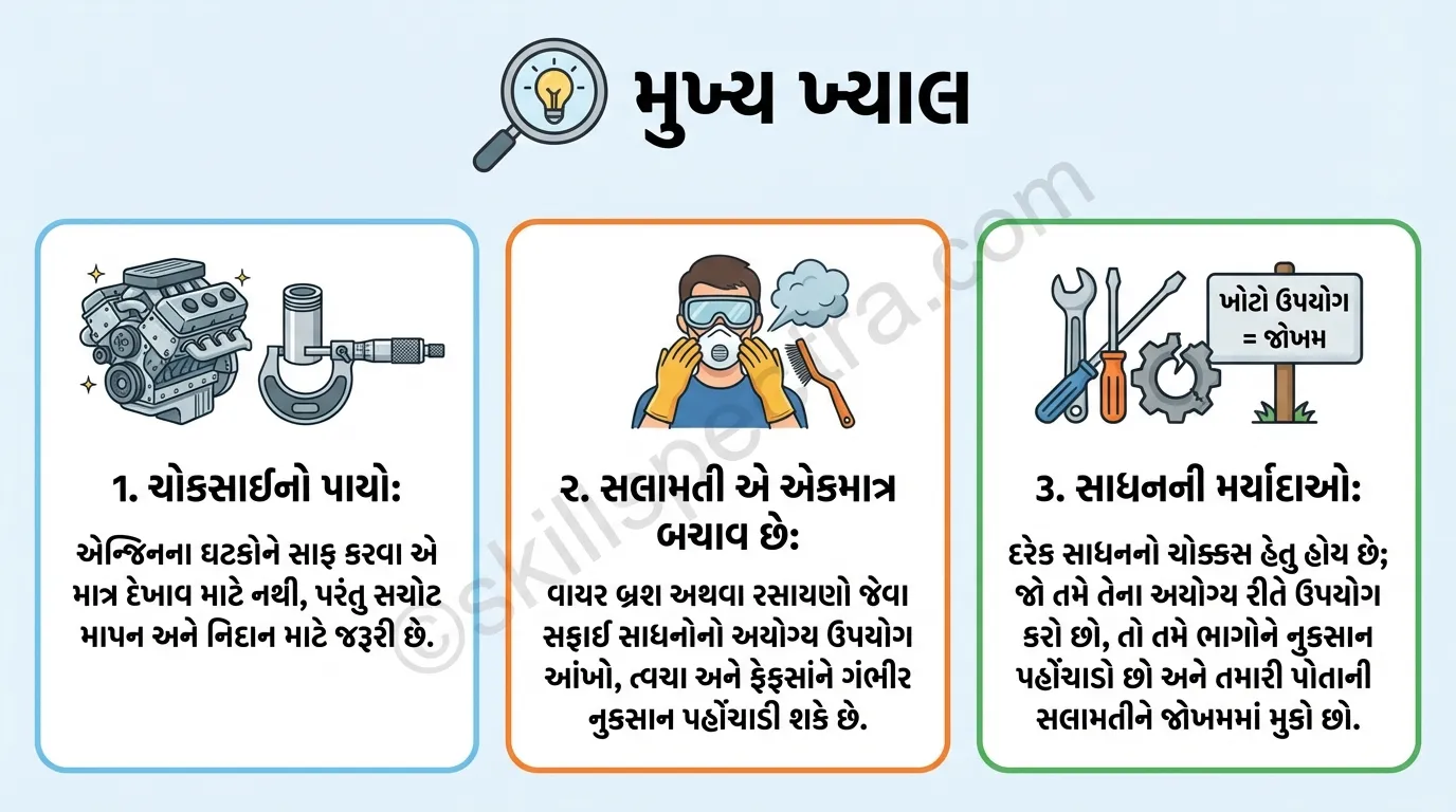 1. **ચોકસાઈનો પાયો:** એન્જિનના ઘટકોની સફાઈ એ માત્ર દેખાવ માટે નથી, પરંતુ તે ચોક્કસ માપન (Measurement) અને નિદાન (Diagnosis) માટે અનિવાર્ય છે.