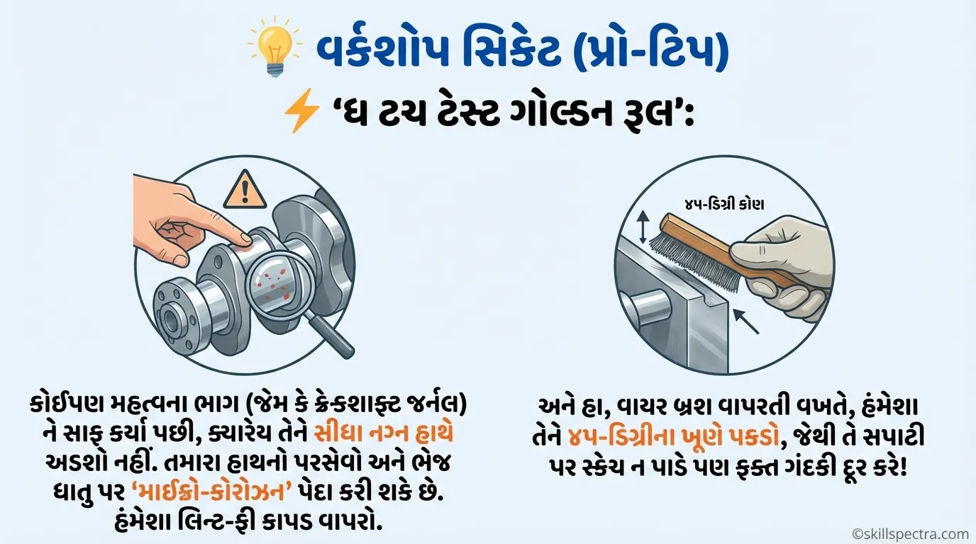 કોઈપણ ક્રિટીકલ પાર્ટ (જેમ કે ક્રેન્કશાફ્ટ જર્નલ) ને સાફ કર્યા પછી, તેને ક્યારેય સીધા ખુલ્લા હાથથી ન અડો. તમારા હાથનો પરસેવો અને ભેજ ધાતુ પર ‘માઇક્રો-કાટ’ (Micro-corrosion) પેદા કરી શકે છે. હંમેશા લિન્ટ-ફ્રી (Lint-free) કપડાનો ઉપયોગ કરો. અને હા, વાયર બ્રશ વાપરતી વખતે તેને હંમેશા **45-ડિગ્રીના ખૂણા** પર રાખો, જેથી તે સપાટીને ખોતરે નહીં પણ માત્ર ગંદકી દૂર કરે!