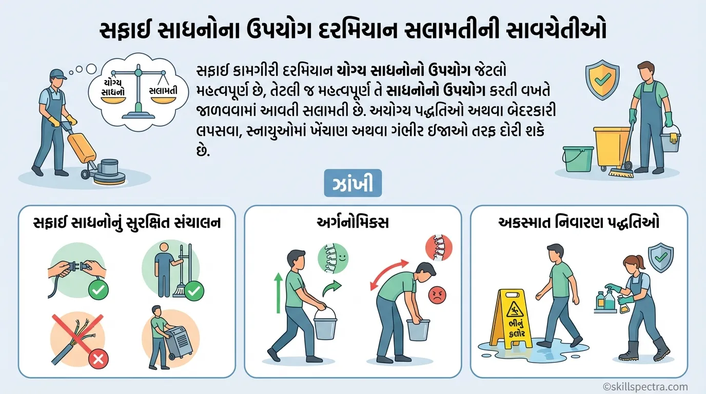 ચોક્કસ, એક વ્યાવસાયિક પ્રશિક્ષક (Vocational Instructor) તરીકે, સફાઈના સાધનોના સુરક્ષિત ઉપયોગ માટેનું શૈક્ષણિક કન્ટેન્ટ નીચે મુજબ છે: