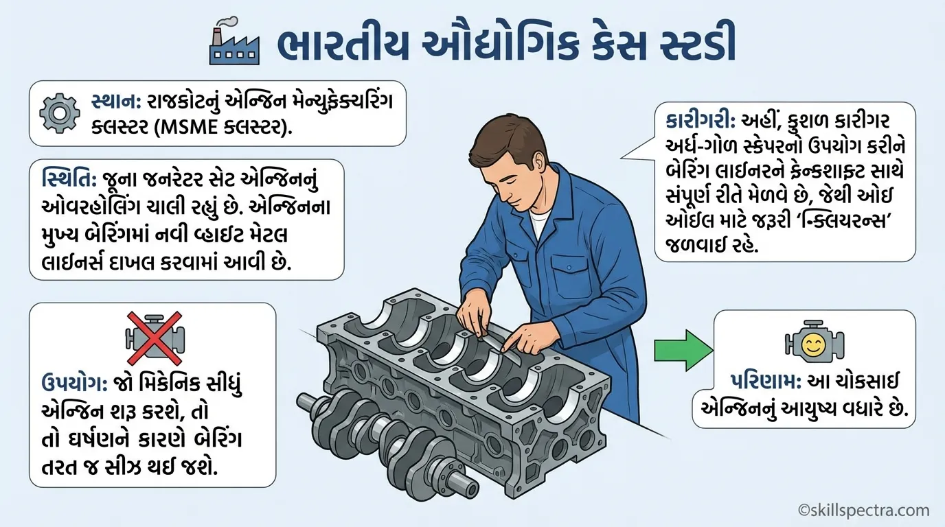 **પરિસ્થિતિ:** એક જૂના જનરેટર સેટના એન્જિનનું ઓવરહોલિંગ (Overhauling) થઈ રહ્યું છે. એન્જિનના મેઈન બેરિંગ (Main Bearing) માં નવા વ્હાઇટ મેટલ લાઇનર્સ નાખવામાં આવ્યા છે.