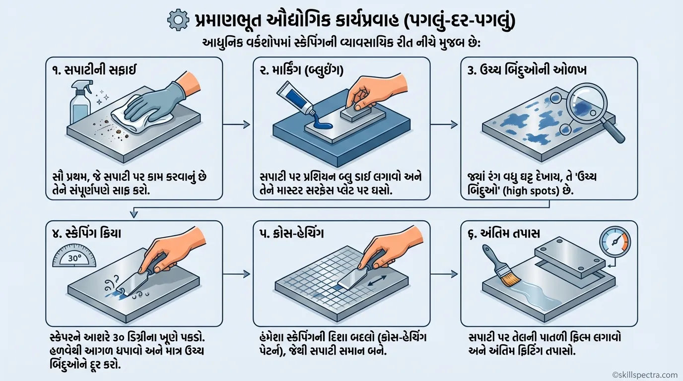 – **માર્કિંગ:** સ્ક્રેપિંગ કરતા પહેલા સપાટી પર **પ્રુશિયન બ્લુ** લગાવીને તેને સરફેસ પ્લેટ પર ઘસવામાં આવે છે, જેથી હાઈ સ્પોટ્સ દેખાય.