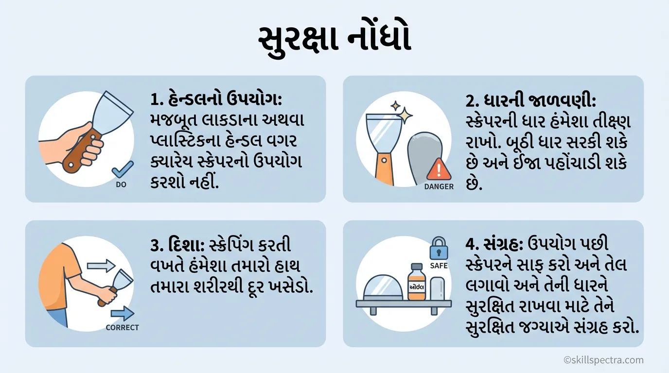 1. **હેન્ડલનો ઉપયોગ:** ક્યારેય પણ લાકડાના કે પ્લાસ્ટિકના મજબૂત હેન્ડલ વગર સ્ક્રેપરનો ઉપયોગ કરવો નહીં.