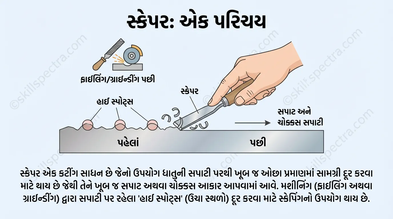**સ્ક્રેપર (Scraper)** એ એક એવું કટિંગ ટૂલ છે જેનો ઉપયોગ ધાતુની સપાટી પરથી ખૂબ જ ઓછી માત્રામાં મટિરિયલ દૂર કરીને સપાટીને અત્યંત સપાટ (Flat) અથવા ચોક્કસ આકાર આપવા માટે કરવામાં આવે છે. જ્યારે મશીનિંગ (ફાઈલિંગ કે ગ્રાઇન્ડિંગ) દ્વારા સપાટી પર રહી ગયેલા **’High Spots’** ને દૂર કરવાના હોય ત્યારે સ્ક્રેપિંગ પ્રક્રિયા હાથ ધરવામાં આવે છે.