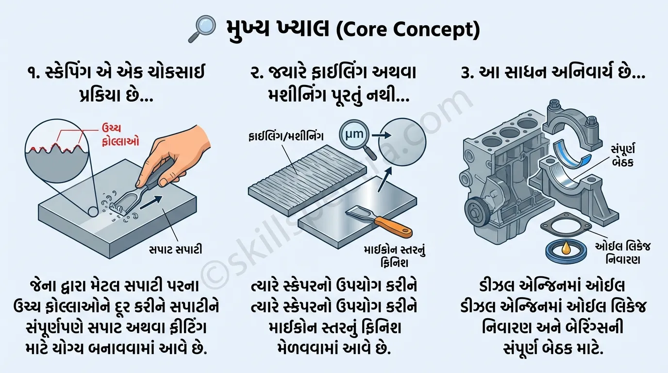 – **ઓઈલ પોકેટ્સ:** સ્ક્રેપિંગ કરવાથી સપાટી પર નાના ખાડા (Depressions) બને છે, જે ઊંજણ તેલ (Lubricating Oil) ને પકડી રાખવામાં મદદ કરે છે.