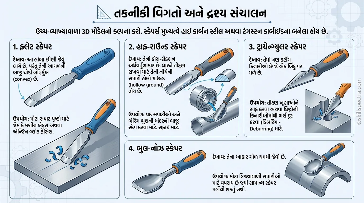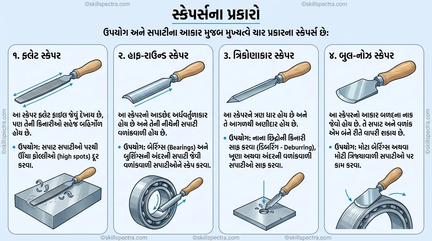 આ માહિતી તમને સ્ક્રેપરના પ્રકારો અને તેના કાર્યકારી ઉપયોગો સમજવામાં મદદરૂપ થશે. ચોકસાઈપૂર્વકના એન્જિનિયરિંગ કામ માટે સ્ક્રેપિંગનું કૌશલ્ય હોવું અનિવાર્ય છે.