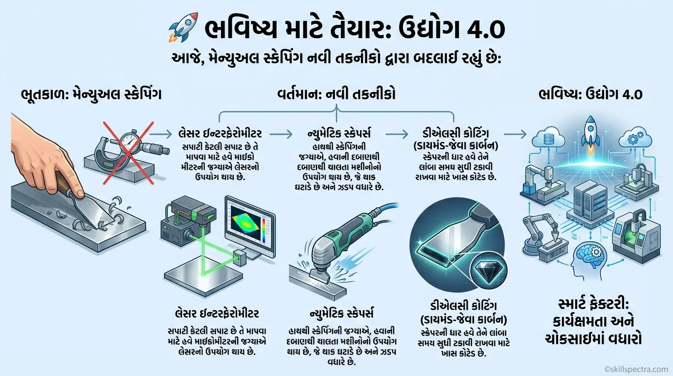 2. જ્યારે ફાઇલિંગ (Filing) કે મશીનિંગ પૂરતું ન હોય, ત્યારે માઇક્રોન લેવલની ફિનિશિંગ મેળવવા માટે સ્ક્રૅપરનો ઉપયોગ થાય છે.