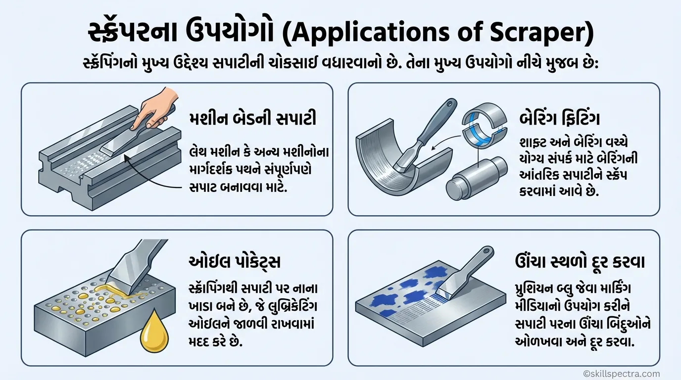 સ્ક્રેપિંગનો મુખ્ય ઉદ્દેશ્ય સપાટીની ચોકસાઈ (Precision) વધારવાનો છે. તેના મુખ્ય ઉપયોગો નીચે મુજબ છે: