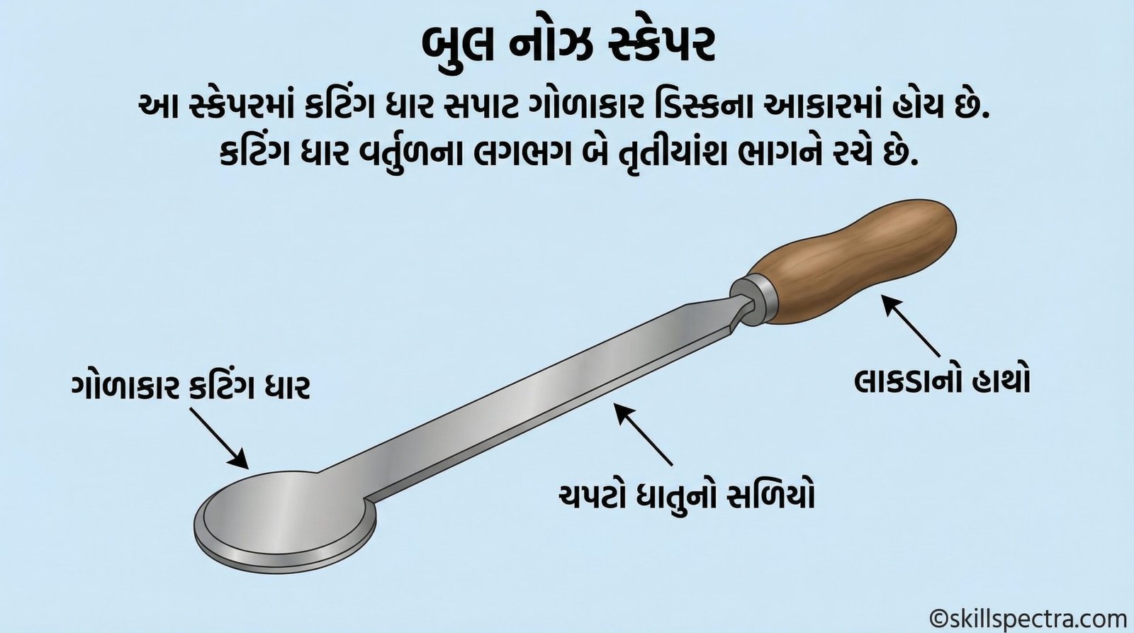 – આ સ્ક્રેપરનો આકાર બળદના નાક જેવો ગોળાકાર હોય છે. તે સપાટ અને વક્ર એમ બંને રીતે વાપરી શકાય છે.