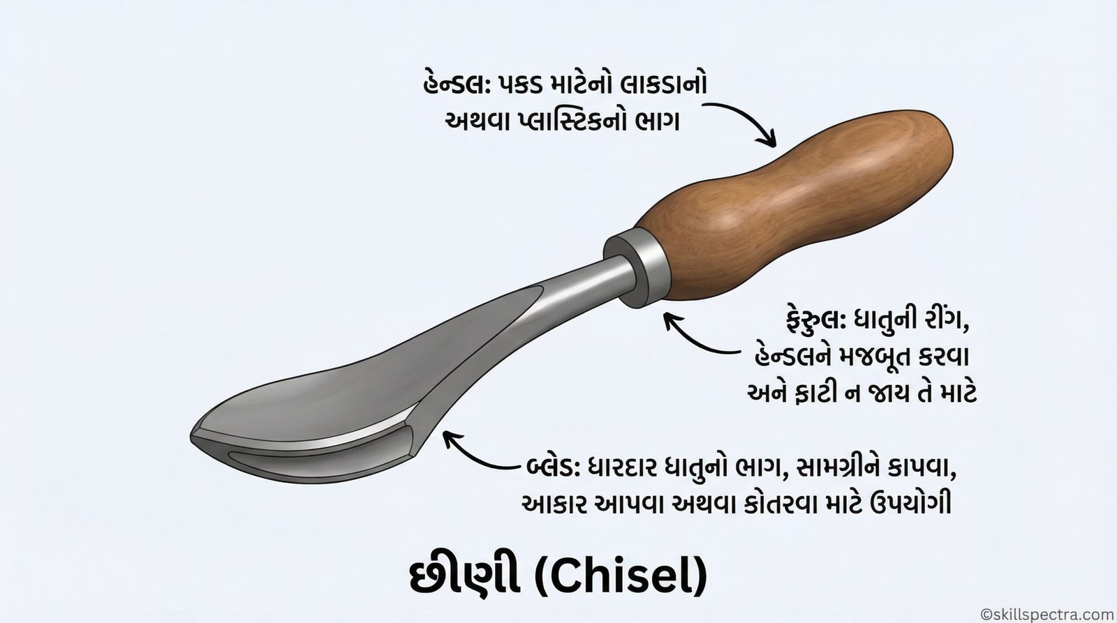 * **દેખાવ:** આ એક લાંબી છીણી (Chisel) જેવું લાગે છે, પરંતુ તેનો આગળનો છેડો સહેજ વળેલો (Convex) હોય છે.