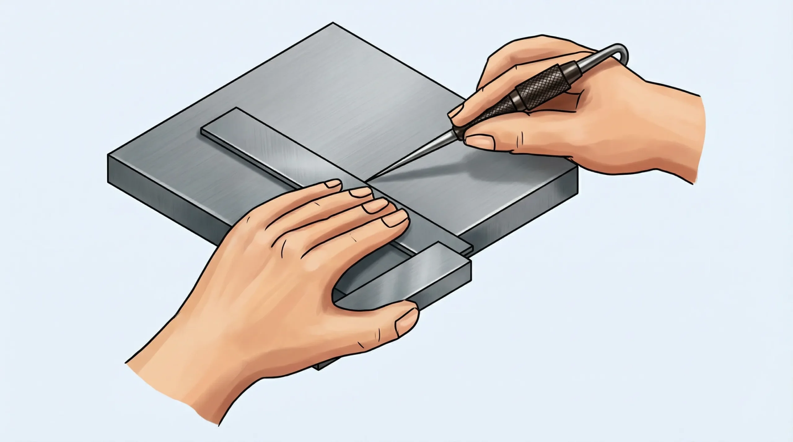 4. **માર્કિંગ (Marking):** જો તમારે ૯૦ ડિગ્રી પર લાઇન દોરવી હોય, તો ‘સ્ક્રાઈબર’ (Scriber) નો ઉપયોગ કરીને બ્લેડની ધારની સાથે ચોકસાઈથી લીટી દોરો.