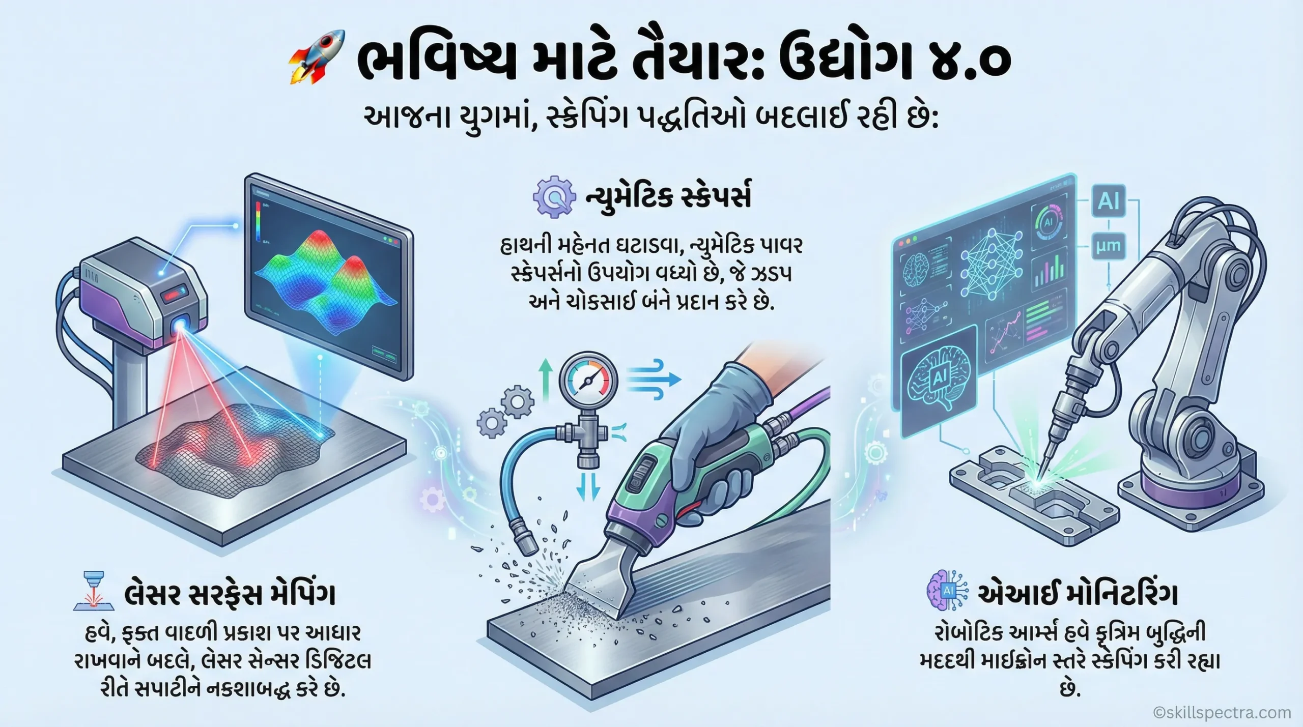 * ન્યુમેટિક સ્ક્રેપર્સ (Pneumatic Scrapers): હાથથી કરવામાં આવતા શ્રમને ઘટાડવા માટે હવાથી ચાલતા પાવર સ્ક્રેપર્સનો ઉપયોગ વધ્યો છે જે ઝડપ અને ચોકસાઈ બંને આપે છે.