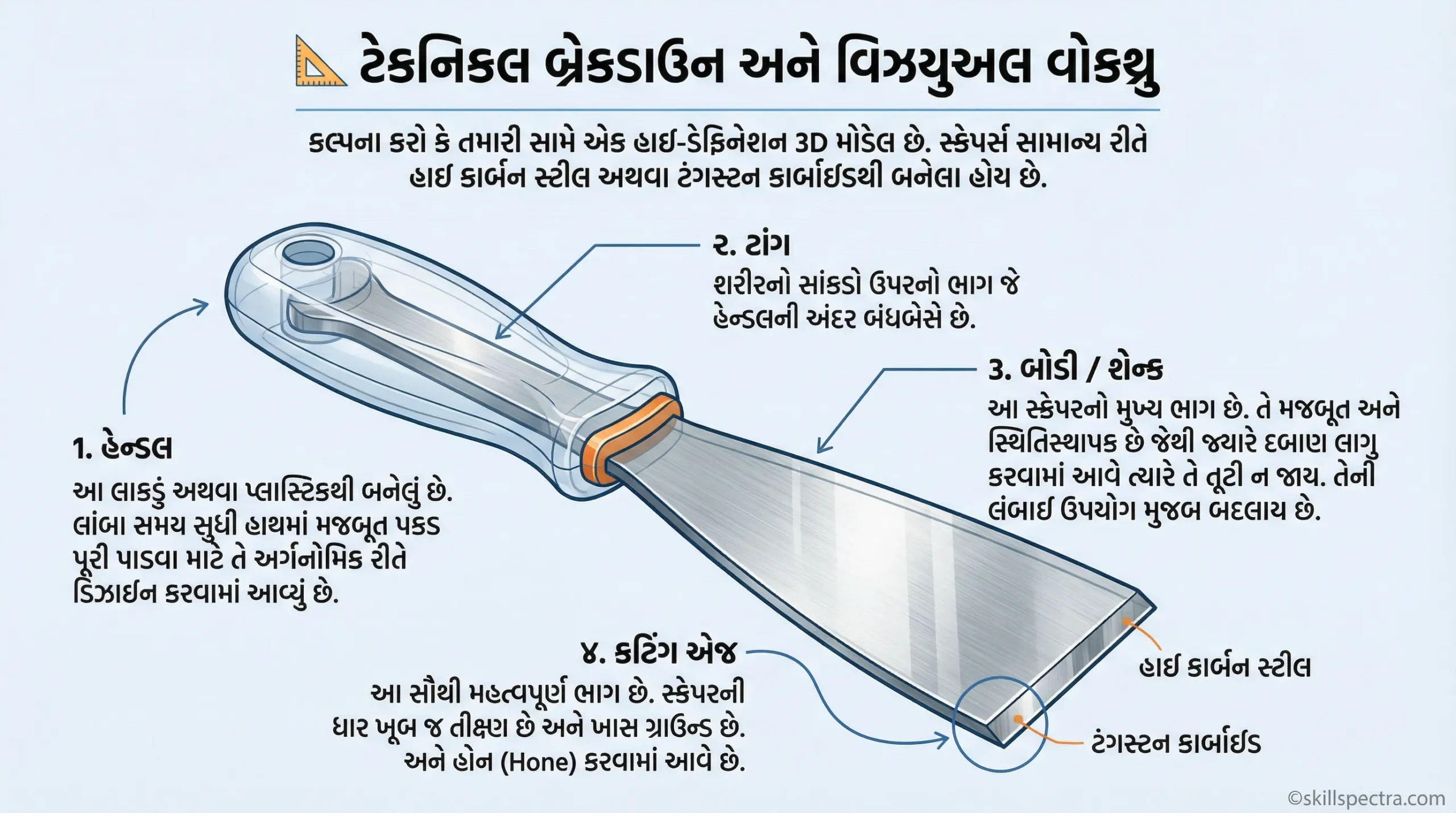 કલ્પના કરો કે તમારી સામે એક હાઈ-ડેફિનેશન 3D મોડેલ છે. સ્ક્રેપર સામાન્ય રીતે હાઈ કાર્બન સ્ટીલ (High Carbon Steel) અથવા ટંગસ્ટન કાર્બાઈડ (Tungsten Carbide) માંથી બનેલું હોય છે.