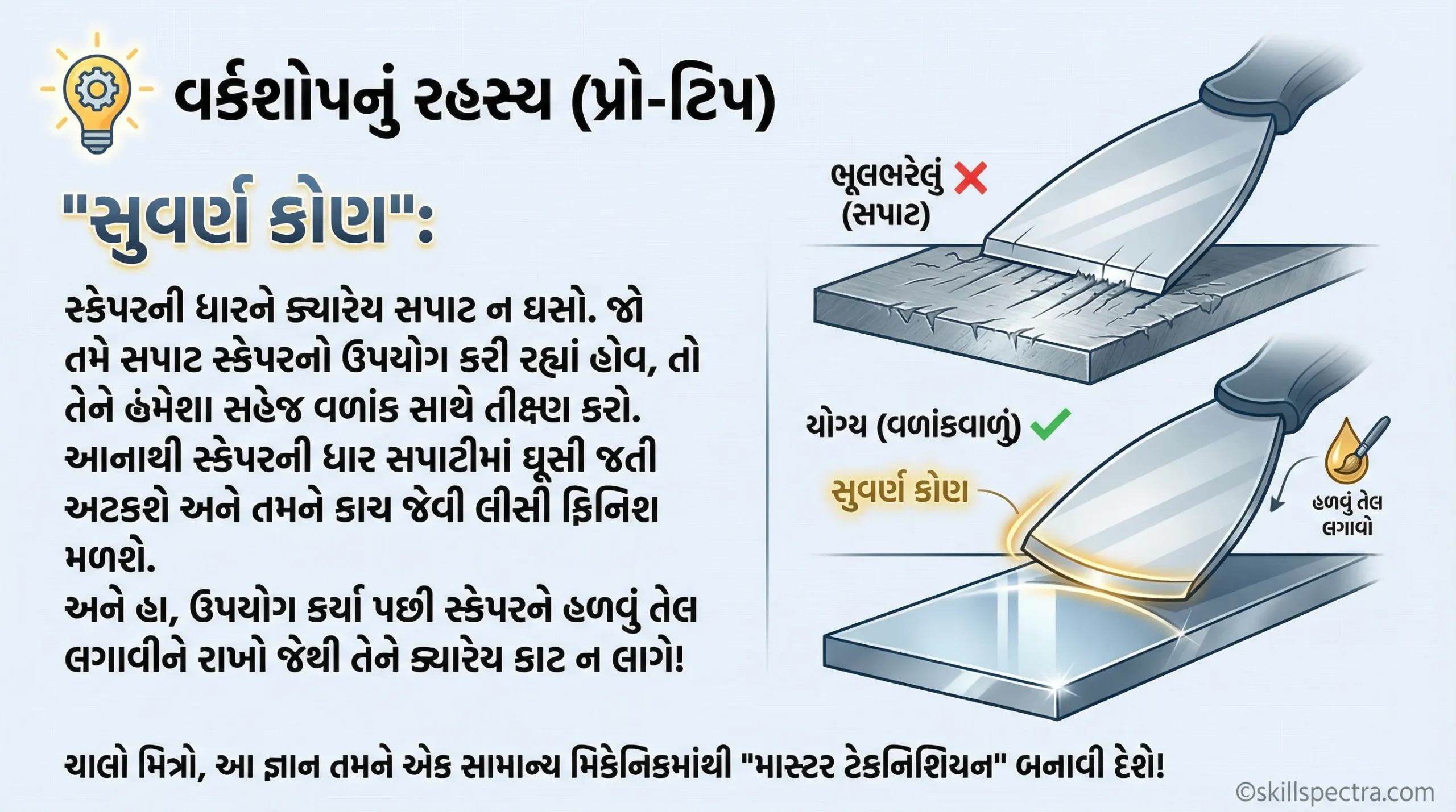 ક્યારેય પણ સ્ક્રેપરની ધારને સીધી (Flat) ન ઘસો. જો તમે ફ્લેટ સ્ક્રેપર વાપરી રહ્યા હોવ, તો તેને હંમેશા સહેજ ગોળાઈ (Curvature) માં શાર્પ કરો. આનાથી સ્ક્રેપરના ખૂણા સપાટીમાં ખૂંપી નહીં જાય (No digging) અને તમને એક કાચ જેવી સ્મૂધ ફિનિશ મળશે. અને હા, સ્ક્રેપરને વાપર્યા પછી તેની ધાર પર હળવું તેલ લગાવીને રાખવું જેથી તે ક્યારેય કટાય (Rust) નહીં!