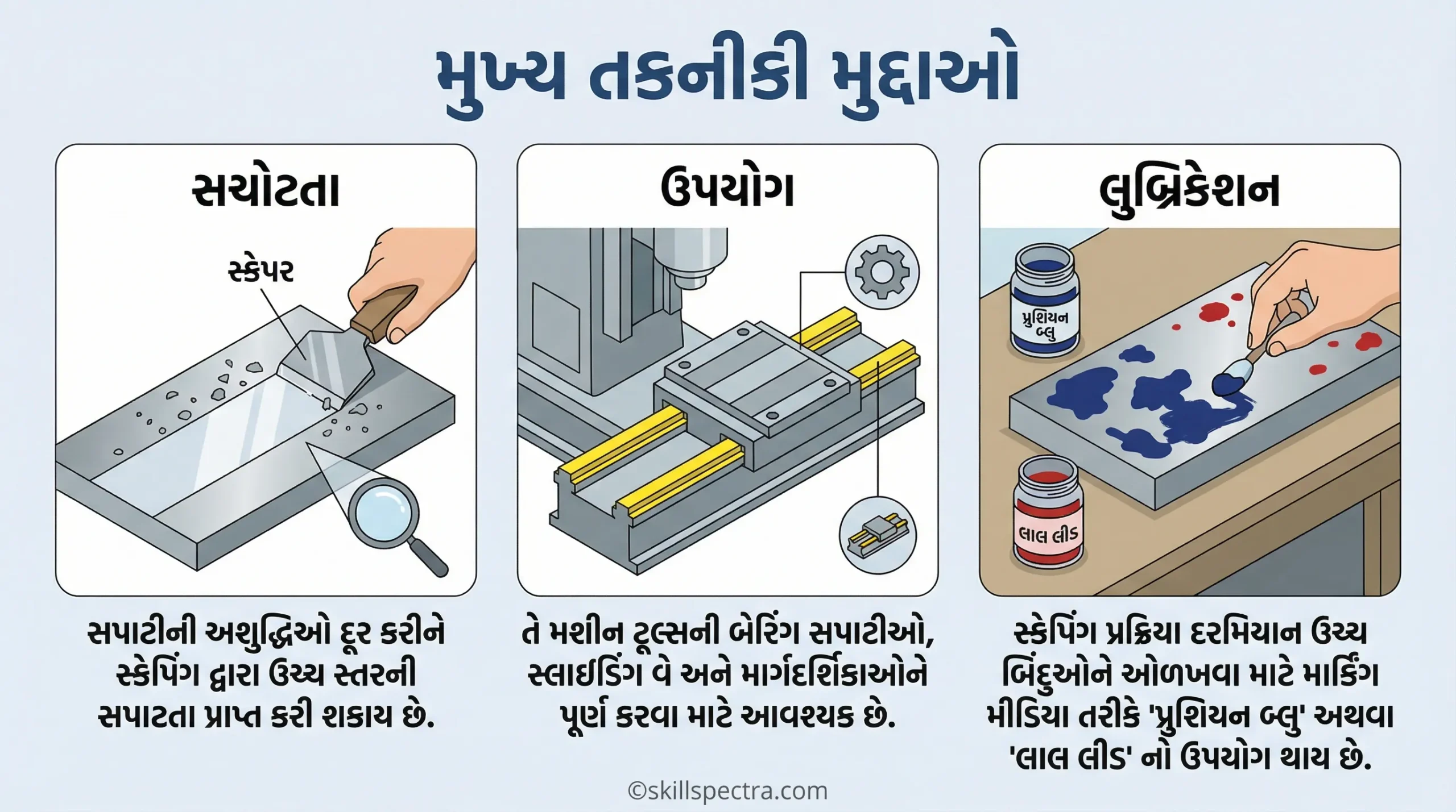 * લ્યુબ્રિકેશન: સ્ક્રેપિંગ પ્રક્રિયા દરમિયાન હાઈ સ્પોટ્સ ઓળખવા માટે **પ્રુશિયન બ્લુ (Prussian Blue)** અથવા રેડ લેડનો ઉપયોગ માર્કિંગ મીડિયા તરીકે થાય છે.