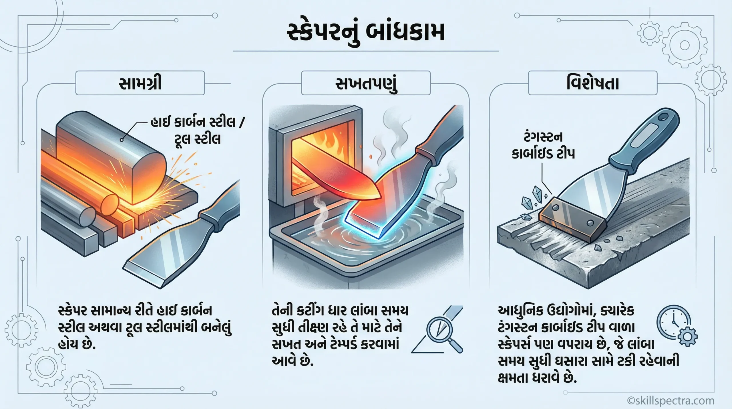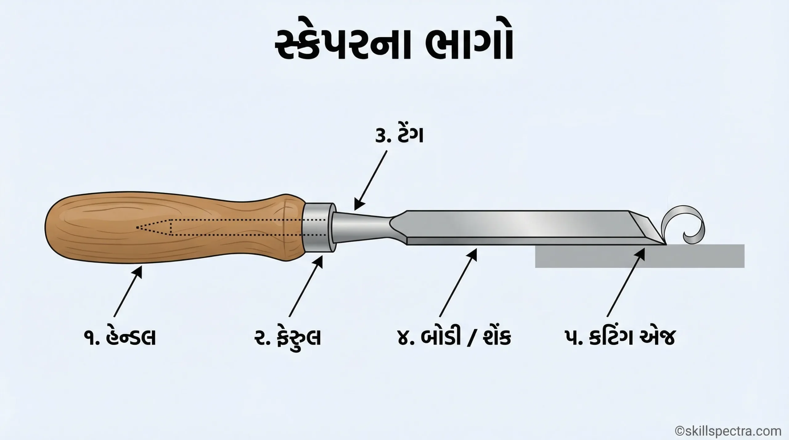 * વિશેષતા: કેટલીકવાર આધુનિક ઉદ્યોગોમાં **ટંગસ્ટન કાર્બાઈડ (Tungsten Carbide)** ટિપવાળા સ્ક્રેપરનો પણ ઉપયોગ થાય છે, જે લાંબા સમય સુધી ઘસારો ખમવાની ક્ષમતા ધરાવે છે.