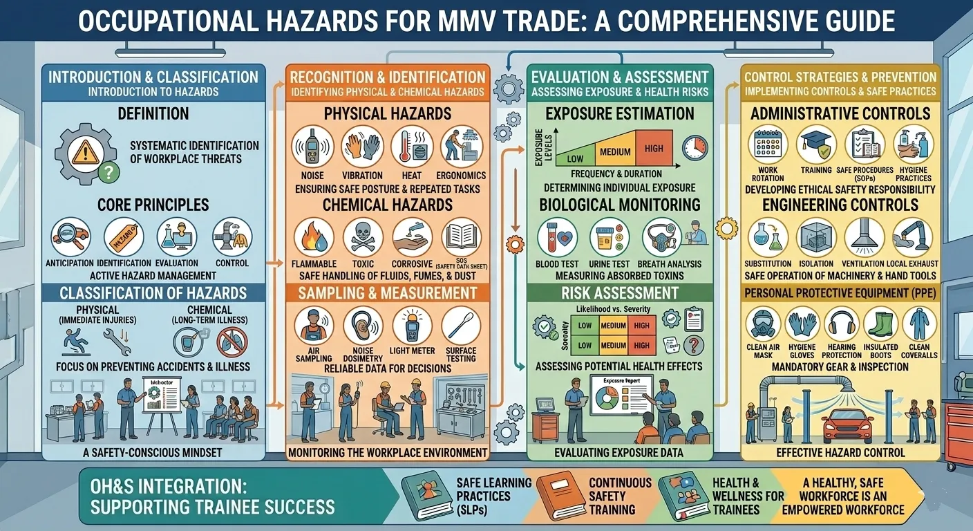 કોઈપણ વ્યવસાય કે કાર્યસ્થળ (Workplace) પર કામ કરતી વખતે કામદારના સ્વાસ્થ્ય અથવા સુરક્ષાને નુકસાન પહોંચાડી શકે તેવી પરિસ્થિતિ કે પરિબળને **વ્યાવસાયિક જોખમ (Occupational Hazard)** કહેવામાં આવે છે. **Mechanic Motor Vehicle (MMV)** ટ્રેડમાં તાલીમાર્થીઓએ ભારે મશીનરી, જ્વલનશીલ પદાર્થો અને રાસાયણિક દ્રવ્યો સાથે કામ કરવાનું હોય છે, તેથી આ જોખમો વિશે જાણકારી હોવી અત્યંત આવશ્યક છે.