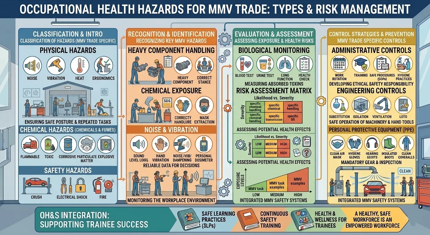 એક **Mechanic Motor Vehicle (MMV)** ટેકનિશિયન તરીકે, વર્કશોપમાં કામ કરતી વખતે વિવિધ પ્રકારના જોખમોનો સામનો કરવો પડે છે. વ્યાવસાયિક સ્વાસ્થ્ય જોખમો એટલે એવા પરિબળો જે કામદારના સ્વાસ્થ્ય પર લાંબા ગાળે અથવા તાત્કાલિક નકારાત્મક અસર કરી શકે છે. આ જોખમોને ઓળખવા અને તેનું નિવારણ કરવું એ સુરક્ષિત કાર્ય વાતાવરણ માટે અનિવાર્ય છે.