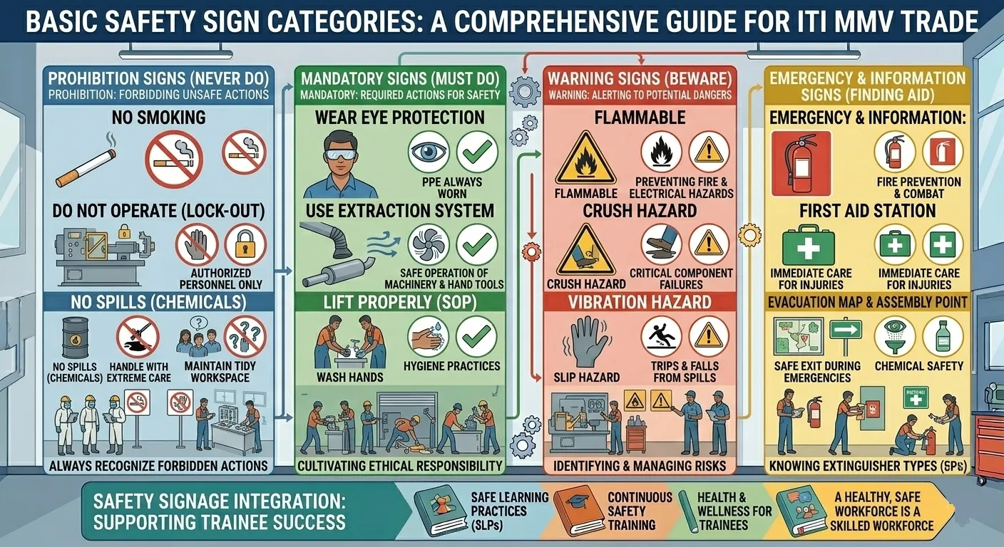 ઔદ્યોગિક તાલીમ સંસ્થાઓ (ITI) માં, ખાસ કરીને **મેકેનિક મોટર વ્હીકલ (MMV)** ટ્રેડમાં, વર્કશોપ સુરક્ષા સૌથી મહત્વપૂર્ણ છે. વર્કશોપમાં વિવિધ મશીનો, જ્વલનશીલ પદાર્થો અને ઇલેક્ટ્રિકલ ઉપકરણો સાથે કામ કરવાનું હોવાથી અકસ્માત થવાની સંભાવના રહેલી છે. સલામતી ચિહ્નો (Safety Signs) એ અકસ્માતો અટકાવવા અને તાલીમાર્થીઓને જોખમો વિશે માહિતગાર કરવાની એક સાર્વત્રિક ભાષા છે. આ ચિહ્નો આકાર અને રંગ દ્વારા ચોક્કસ સંદેશ આપે છે, જે દરેક ટેકનિશિયને સમજવા અનિવાર્ય છે.