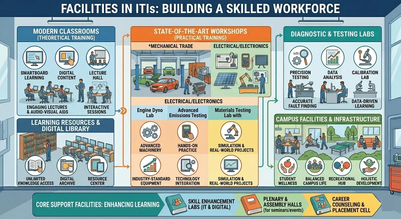 ઔદ્યોગિક તાલીમ સંસ્થા (I.T.I) એ કુશળ કારીગરો તૈયાર કરવા માટેનું મુખ્ય કેન્દ્ર છે. મિકેનિક મોટર વ્હીકલ જેવા ટેકનિકલ ટ્રેડમાં માત્ર સૈદ્ધાંતિક જ્ઞાન પૂરતું નથી, પરંતુ વ્યવહારુ (Practical) જ્ઞાન અત્યંત અનિવાર્ય છે. આ તાલીમ આપવા માટે આઈ.ટી.આઈ. માં વિવિધ પ્રકારની સુવિધાઓ ઉપલબ્ધ કરાવવામાં આવે છે, જે તાલીમાર્થીના સર્વાંગી વિકાસ અને કાર્યક્ષમતામાં વધારો કરે છે.