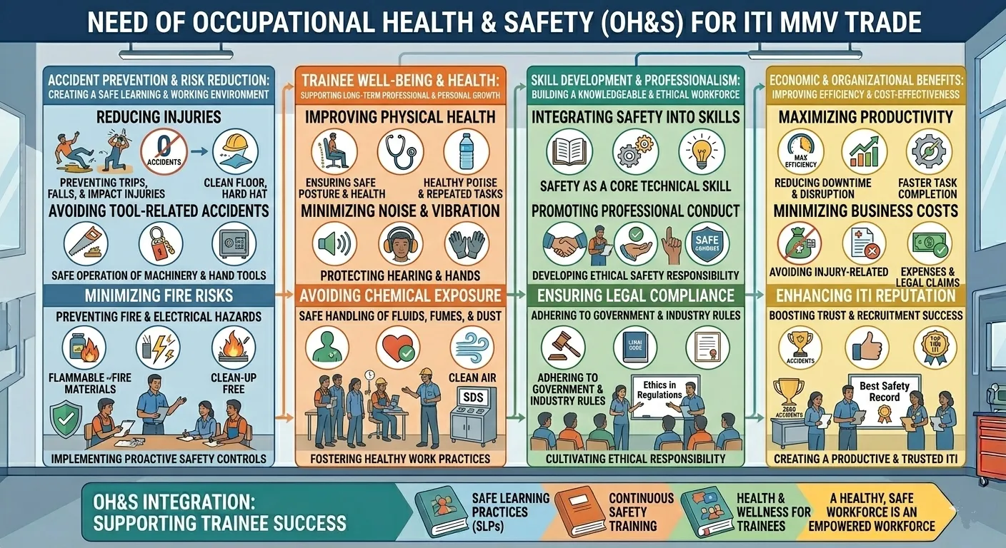 કોઈપણ ઔદ્યોગિક તાલીમ સંસ્થા (ITI) અથવા ઓટોમોબાઈલ વર્કશોપમાં કાર્ય કરતી વખતે ‘વ્યવસાયિક આરોગ્ય અને સુરક્ષા’ (**Occupational Health and Safety – OH&S**) એ પાયાની જરૂરિયાત છે. મેકેનિક મોટર વ્હીકલ (MMV) જેવા ટ્રેડમાં તાલીમાર્થીઓ ભારે મશીનરી, જ્વલનશીલ ઇંધણ, જોખમી રસાયણો અને વીજળી સાથે કામ કરે છે. આ વિષયનો મુખ્ય હેતુ કાર્યસ્થળ પર અકસ્માતો ઘટાડવાનો અને કામદારોના સ્વાસ્થ્યનું રક્ષણ કરવાનો છે.