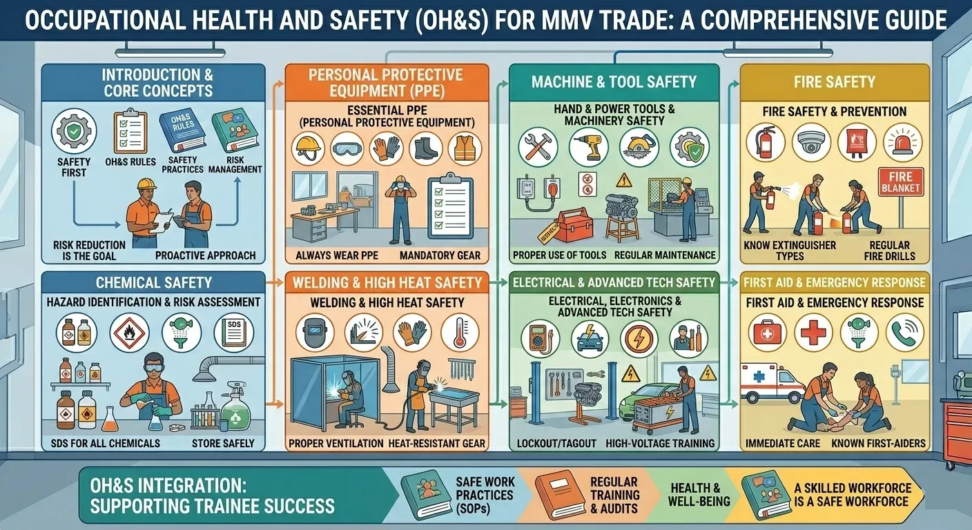 નમસ્કાર તાલીમાર્થી મિત્રો! એક પ્રોફેશનલ **Mechanic Motor Vehicle (MMV)** ટેકનિશિયન બનવાની તમારી સફરમાં ‘સુરક્ષા’ એ સૌથી પહેલું અને મહત્વનું સોપાન છે. યાદ રાખજો, એક કુશળ કારીગર તે જ છે જે કામ પૂરું કરીને સુરક્ષિત ઘરે પાછો ફરે છે.